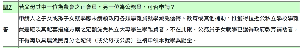 - (6)公教員工子女已因高職免學費方案獲教育部學費減免,或身心障礙之公教員工子女已獲減免學雜費者,基於國家整體資源之合理運用,政府各項助學措施宜擇優擇一支領之原則,已領取其他政府提供之獎助,或全免或減免學雜費者,不得申請子女教育補助。