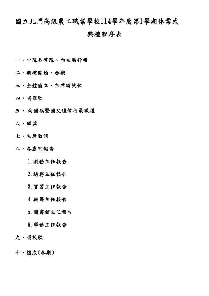 公告國立北門高級農工職業學校 114 學年度第 1 學期休業式