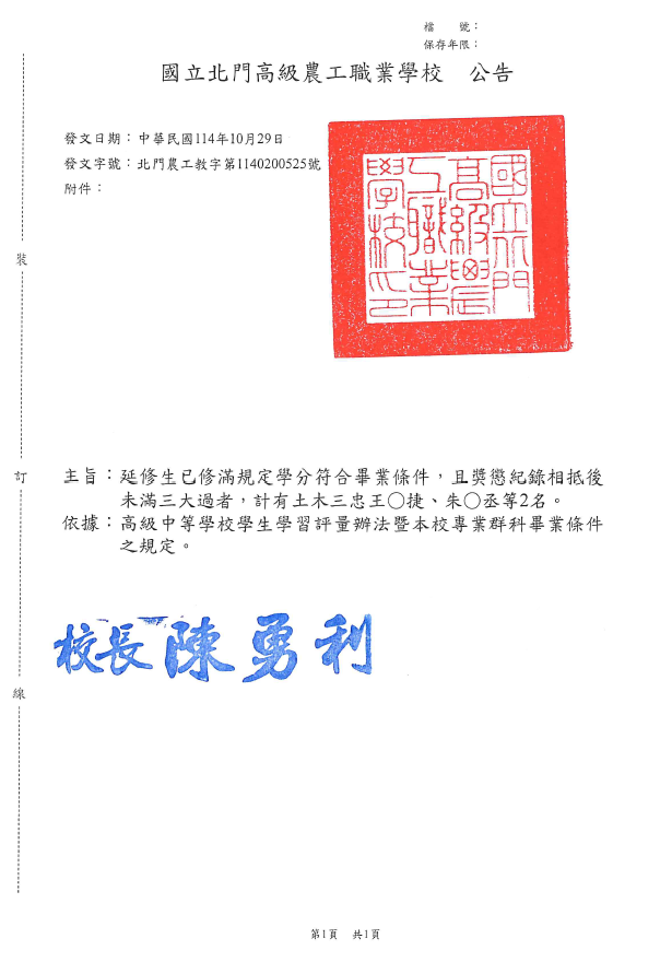 Post category:最新消息Post last modified:2025-10-29Post author:pmaitn011畢業證書俟製作完成後另行通知,請攜帶 身分證及印章 至教務處註冊組領取。延修生符合畢業條件學生-1141029下載 Post Views: 23