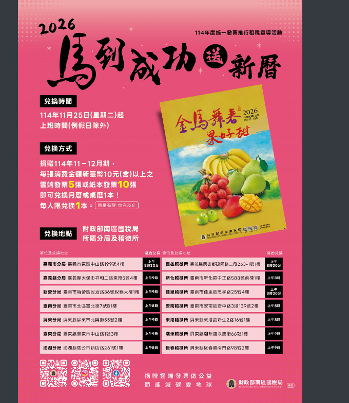 Post category:學務處公告 / 最新消息Post last modified:2025-11-13Post author:pmaitn050財政部南區國稅局114年度統一發票暨馬到成功送新曆宣導活動海報下載 Post Views: 8