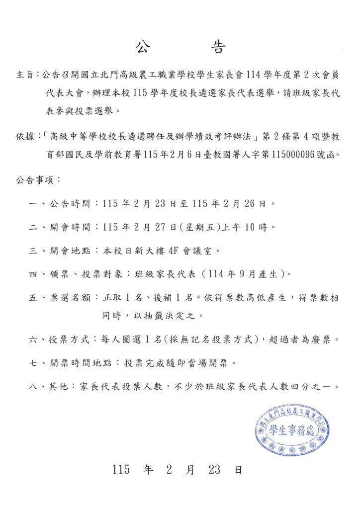 115學年度國立高級中等學校校長遴選「家長代表」選舉公告